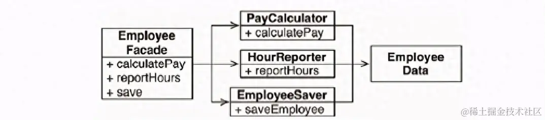 当然,也有些程序员更倾向于把最重要的业务逻辑与数据放在一起,那么我们也可以选择将最重要的函数保留在 Employee类中,同时用这个类来调用其他没那么重要的函数(见下图)。