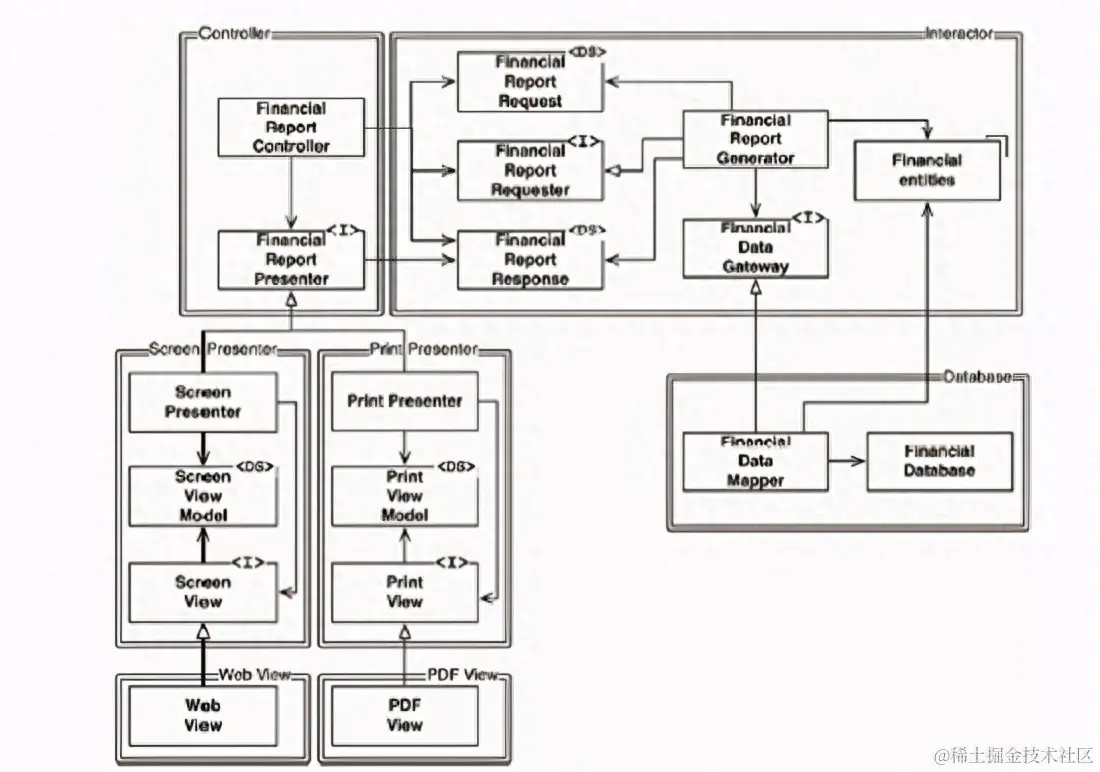 例如,FinancialReportGenerator和FinancialDataMapper之间的FinancialDataGateway接口是为了反转 interactor与Database之间的依赖关系而产生的。同样的,FinancialReportPresente接口与两个View接口之间也类似于这种情况。