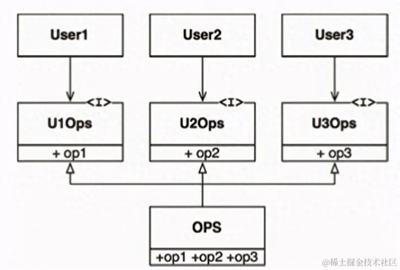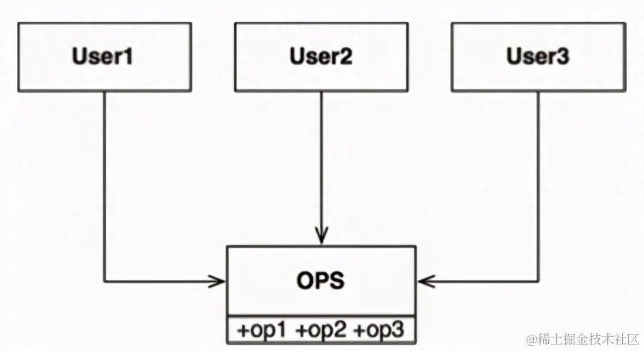 在图中所描绘的应用中,有多个用户需要操作OPS类。现在,我们假设这里的User1只需要使用op1,User2只需要使用op2,User3只需要使用op3。