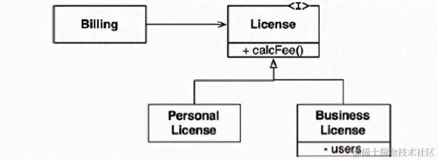 假设我们有一个 License类,其结构如下图所示。该类中有一个名为 callee()的方法,该方法将由Billing应用程序来调用。而 License类有两个“子类型” :PersonalLicense与 Businesslicense,这两个类会用不同的算法来计算授权费用。