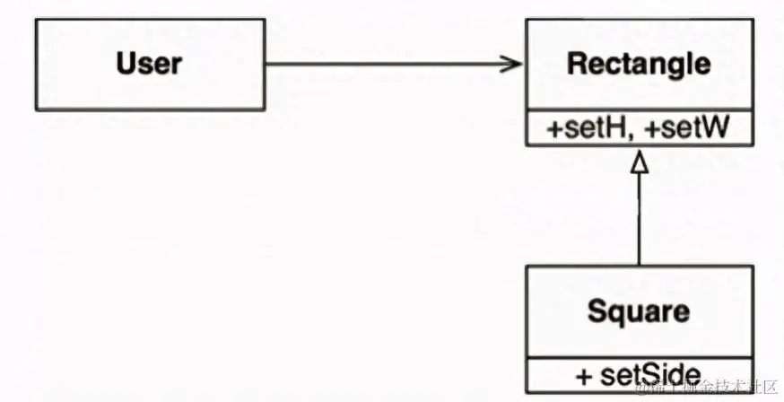 在这个案例中, Square类并不是 Rectangle类的子类型,因为 Rectangle类的高和宽可以分别修改,而 Square类的高和宽则必须一同修改。由于User类始终认为自己在操作 Rectangle类,因此会带来一些混淆。例如在下面的代码中: