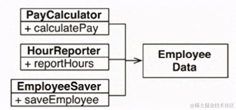 这三个函数被放在同一个源代码文件,即同一个Employee类中,程序员这样做实际上就等于使三类行为者的行为耦合在了一起,这有可能会导致CFO团队的命令影响到COO团队所依赖的功能。