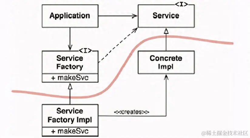 下面,我们通过下图来描述一下该设计模式的结构。如你所见, Application类是通过 Service接口来使用 Concretelmp类的。然而, Application类还是必须要构造 Concretelmpl类实例。于是,为了避免在源代码层次上引入对 Concretelmpl类具体实现的依赖,我们现在让 Application类去调用ServiceFactory接口的 makeSvc方法。这个方法就由 ServiceFactorylmpl类来具体提供,它是ServiceFactoryl的一个衍生类。该方法的具体实现就是初始化一个 Concretelmpl类的实例,并且将其以 Service类型返回。