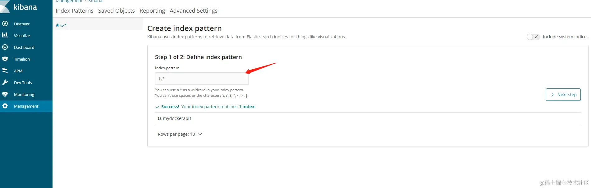 运行起来后,打开你的ip:5601,刚进来会让你创建索引,步骤如下图