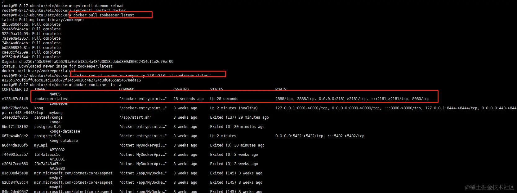 docker run -d --name zookeeper -p 2181:2181 -t zookeeper:latest