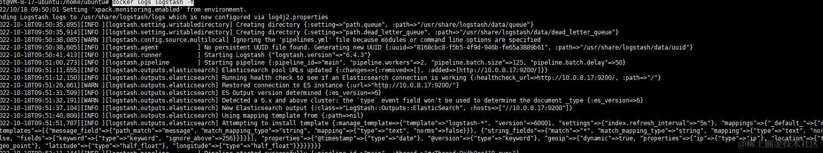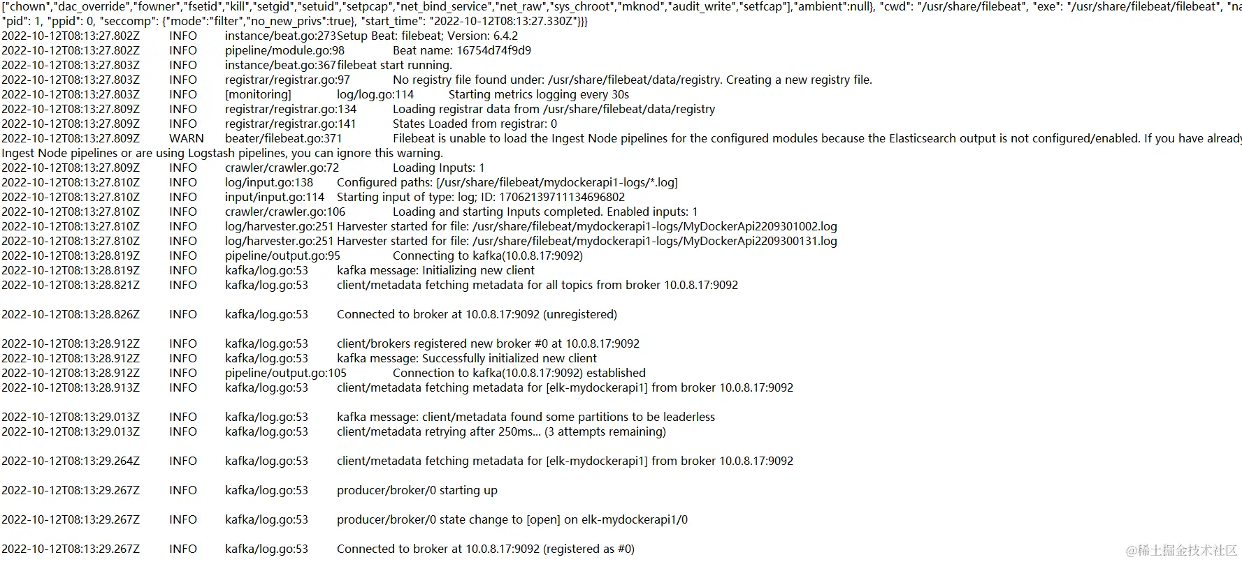 使用 docker logs -f filebeat 命令,查看filebeat日志