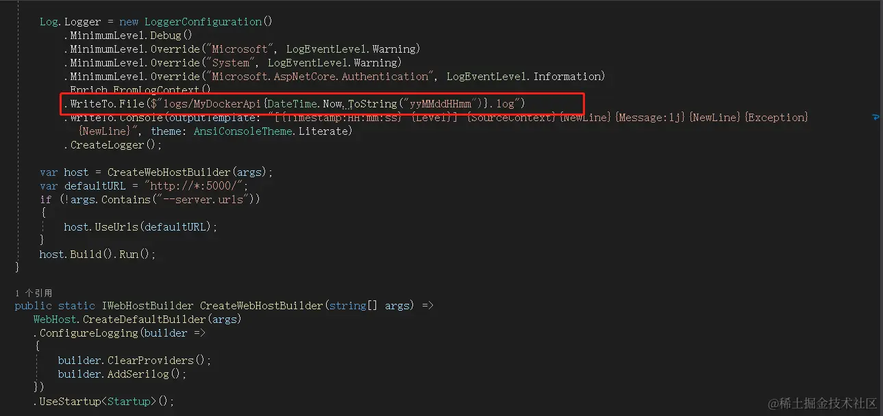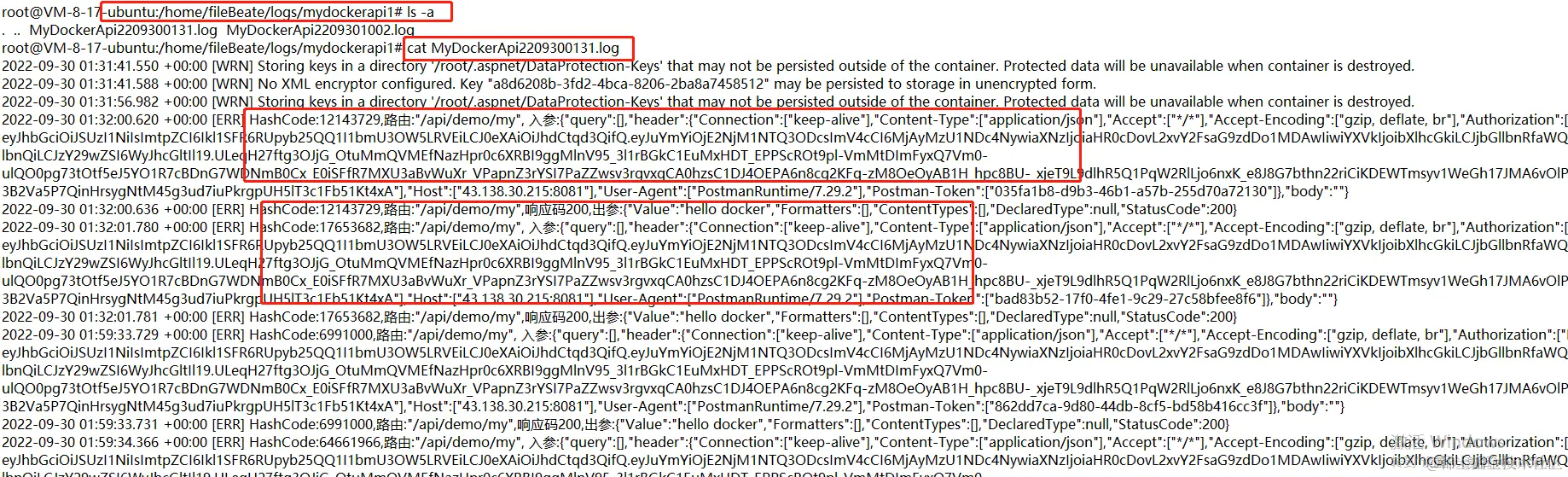 我这里,将日志写到根目录下logs文件夹,以MyDockerApi *.log产生日志文件,接下来,发布,并上传到linux服务器,并用docker启动,不会的同学传送门:www.cnblogs.com/saltlight-w…。
