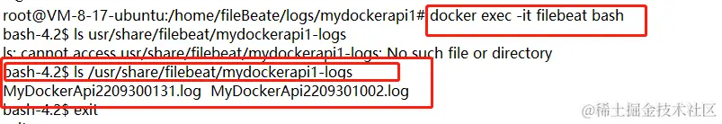 进入filebeat容器内部如下图,可以看到已经采集到日志文件