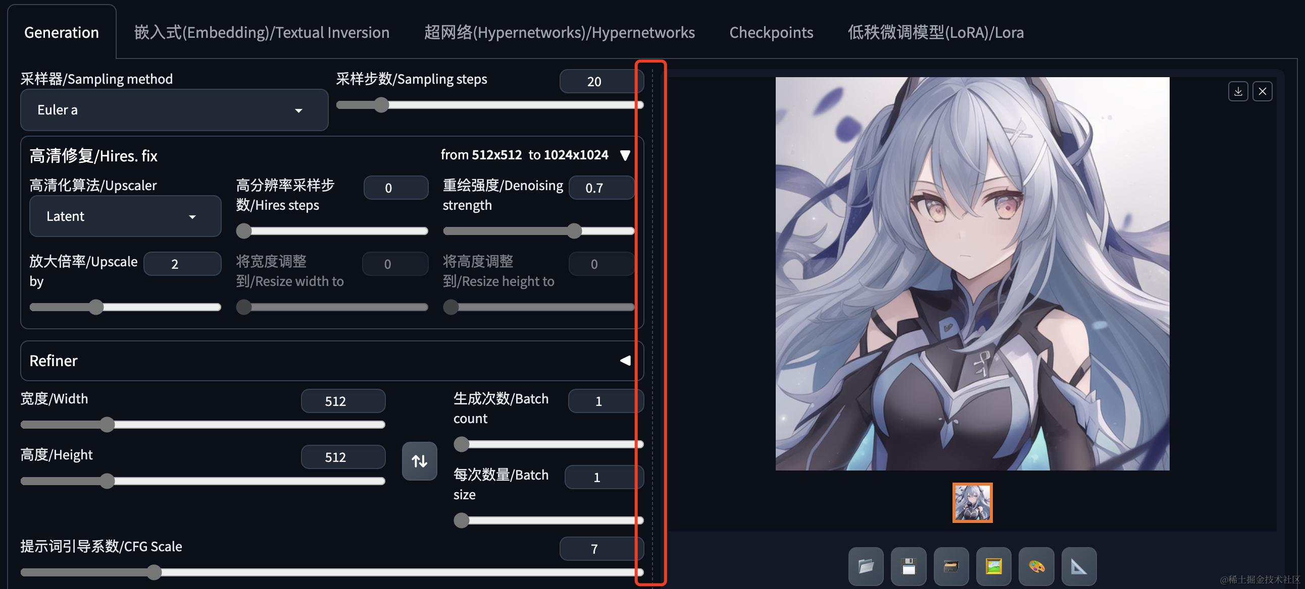 这个我感觉方便了很多,之前要使用 Lora 模型时,先得通过一个按钮打开小模型的面板,然后再切换到 Lora 的页签,然后再选择要使用的 Lora。这个小模型的选择面板还挺占用空间的,不需要了还得再点击小按钮把小模型的面板隐藏起来。