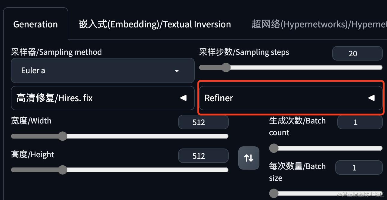 在 Stable Diffusion的生图参数中,新增了一个 Refiner 的模块,就在之前的“高清修复”旁边。默认情况下,“Refiner”和“高清修复”都被折叠了起来,也就是不使用它们。