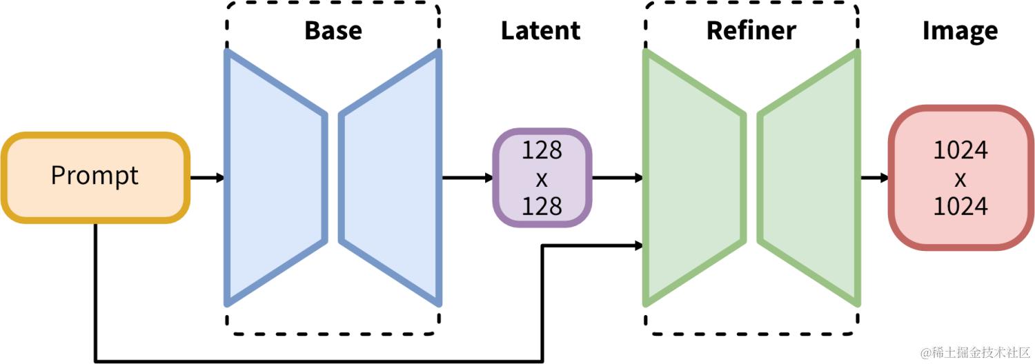 了解过 SDXL 的同学可能已经知道,SDXL 采用了一种两步走的生图方式,先用1个基础模型生成一张看起来差不多的图片,然后再使用一个精修模型把它打磨的更漂亮。示意图如下: