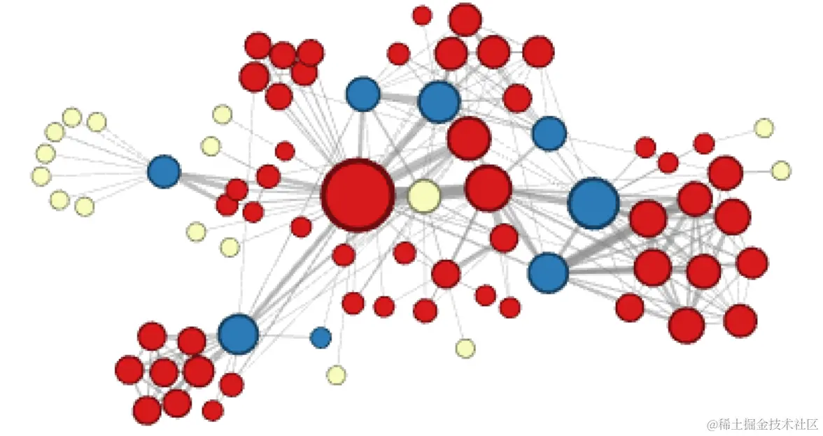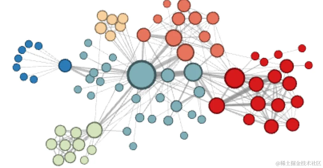 为了演示哪些节点在网络中具有结构等价性,我们设置参数 ,使用 node2vec 学习节点特征,然后根据特征聚合节点。此处,node2vec 获得了节点到社区关系的补充特性,颜色代表这些节点结构等价。