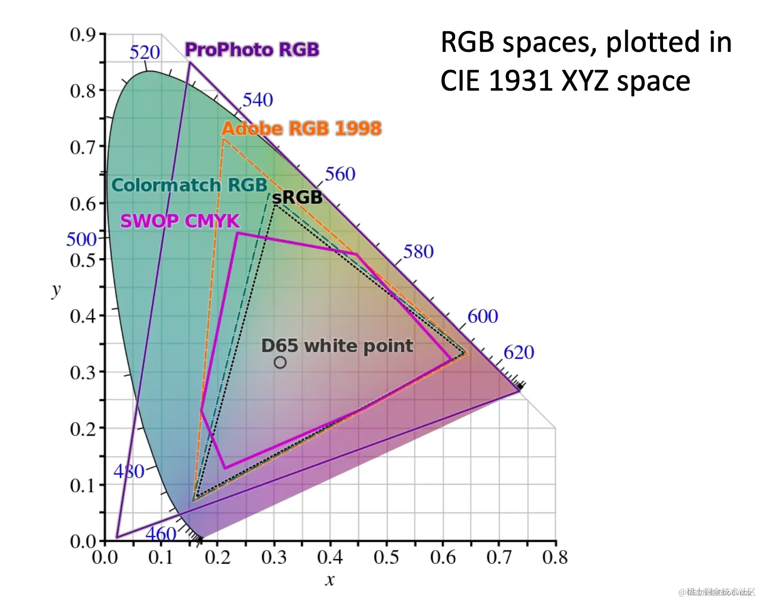 - 对于各种颜色空间和白点(在给定颜色空间中定义为“白色”的值),都可以查找矩阵 ( M ) 的值。这些矩阵定义了如何从一个颜色空间转换到另一个颜色空间。