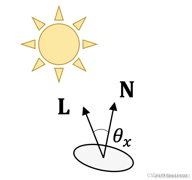 - :在点 上的表面法线与入射光方向之间的夹角的余弦值。这是一个介于 0 和 1 之间的值,表示光线与表面的相对方向。