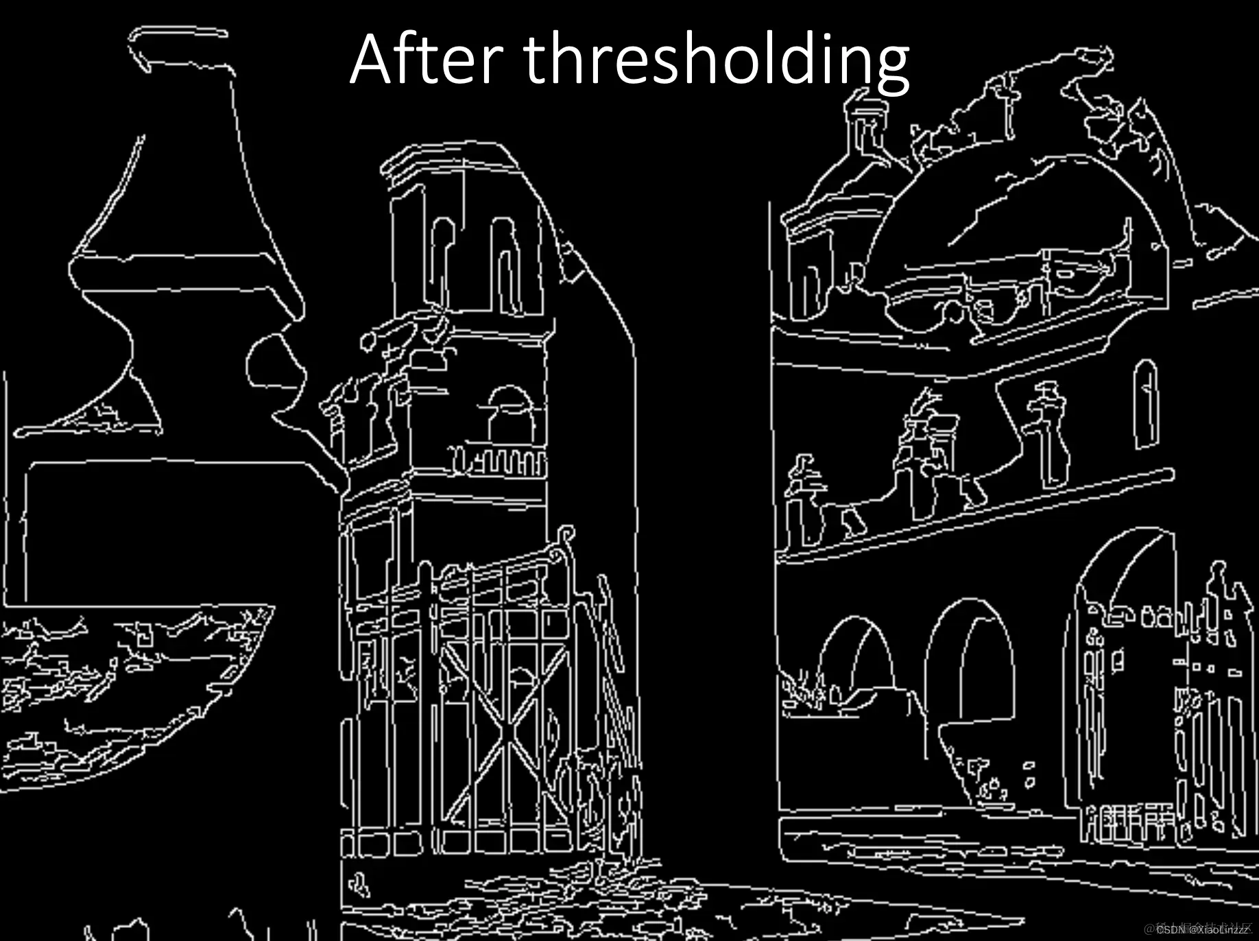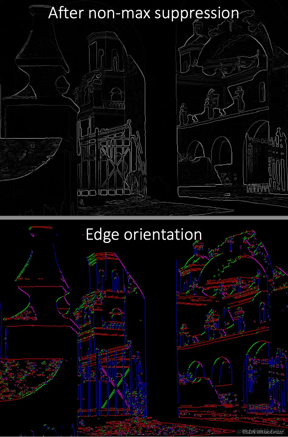 - 梯度后处理,更好地定位边缘 (非极大值抑制)并保留 模糊/破碎边缘(边缘检测的阈值处理)