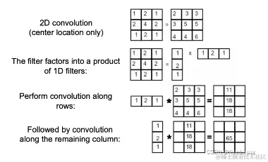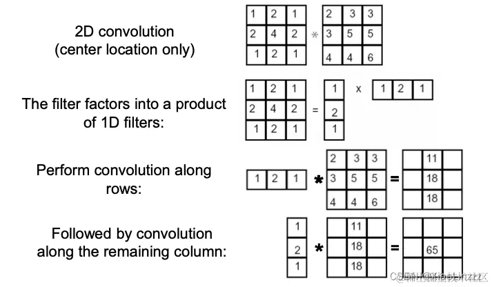 当我们需要应用一个二维滤波器时,通过将其分解成两个一维滤波器的乘积,可以大幅提高滤波的计算效率。