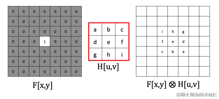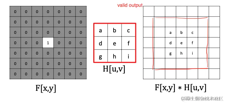 - 从理论上讲,卷积核(h)和图像(f)的顺序不影响最终结果。