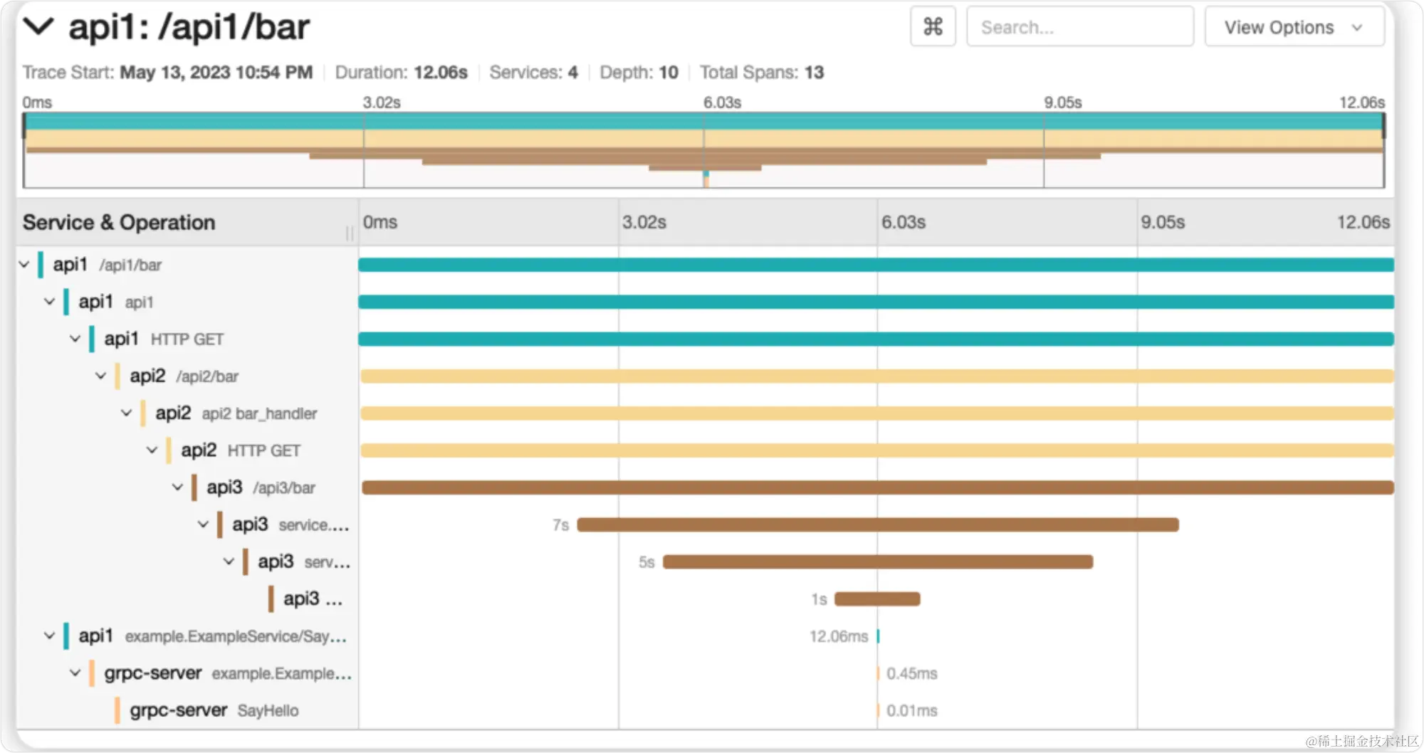 - 示例集成了docker 环境,支持 make deploy 同时启动 jaeger,api1,api2,api3,grpc 服务