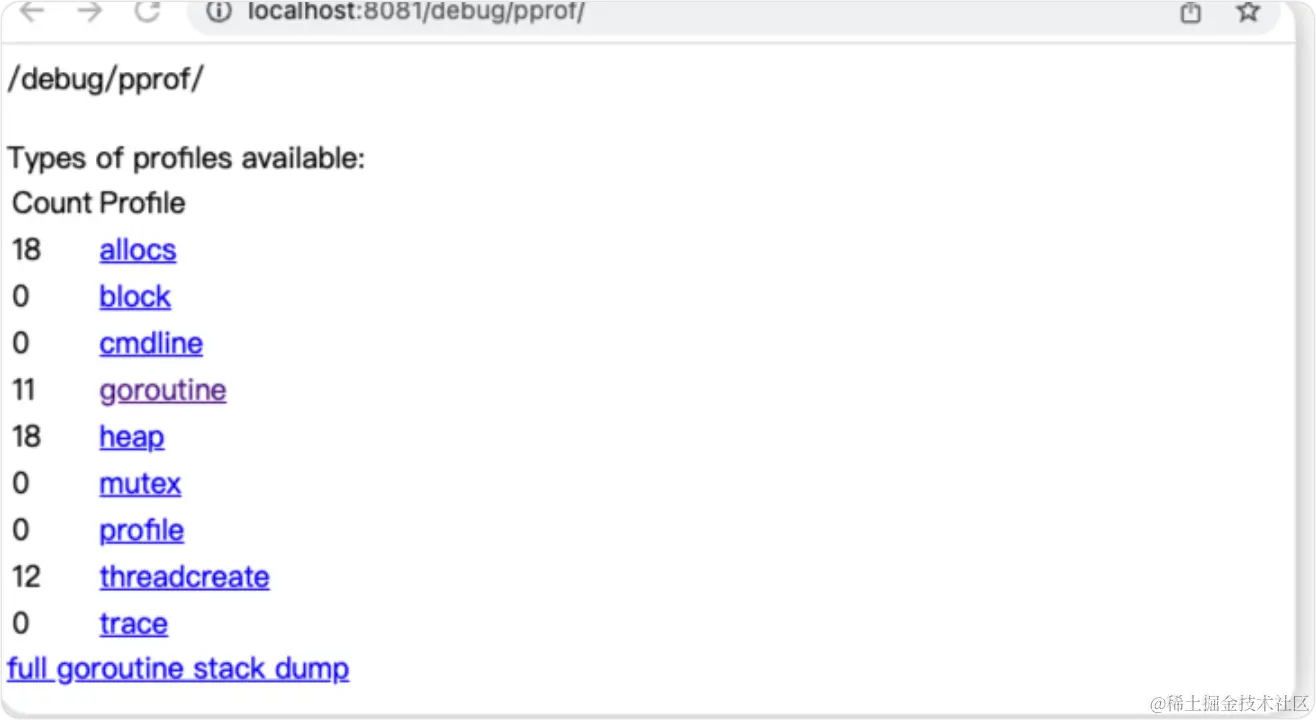 启动服务默认开启 pprof 性能分析,浏览器打开 http://localhost:8081/debug/ 查看
