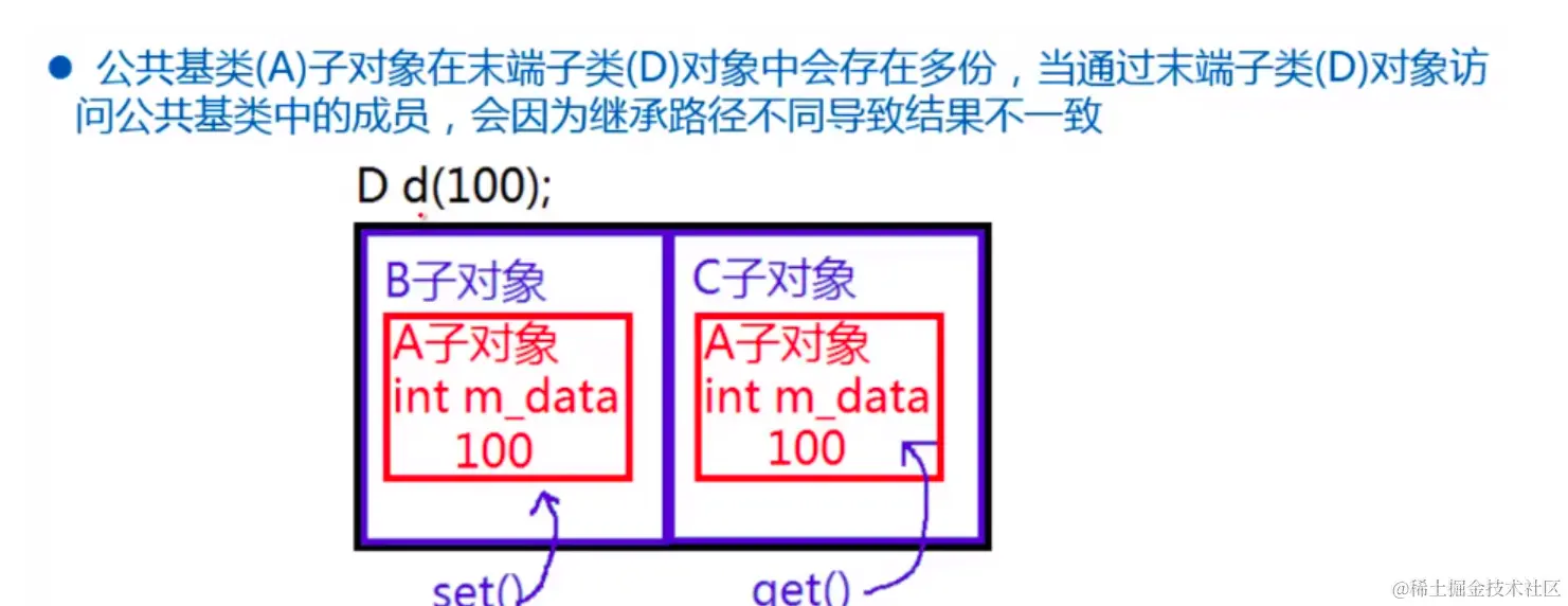 D 是多继承形式的派生类,它以公有的方式继承 A 类,以私有的方式继承 B 类,以保护的方式继承 C 类。D 根据不同的继承方式获取 A、B、C 中的成员,确定它们在派生类中的访问权限。