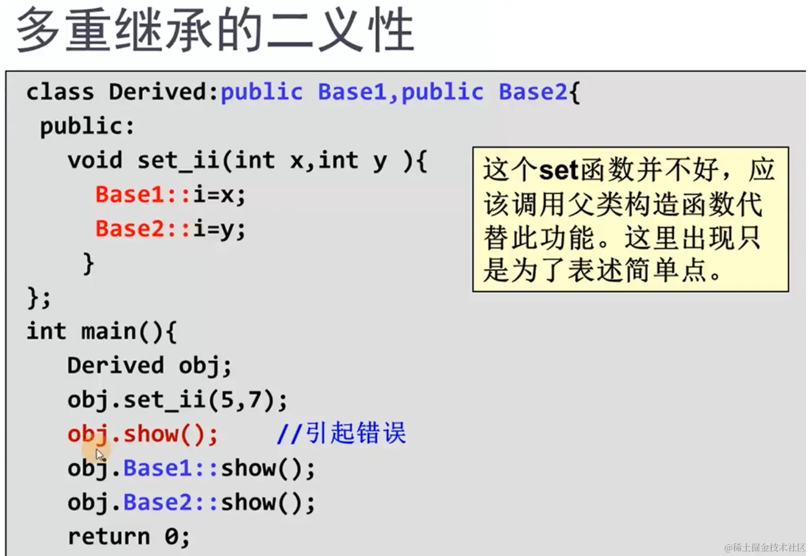 当两个或多个基类中有同名的成员时,如果直接访问该成员,就会产生命名冲突,编译器不知道使用哪个基类的成员。这个时候需要在成员名字前面加上类名和域解析符::,以显式地指明到底使用哪个类的成员,消除二义性。