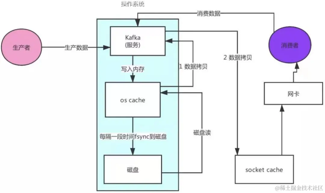 kafka写数据:顺序写,往磁盘上写数据时,就是追加数据,没有随机写的操作。经验: 如果一个服务器磁盘达到一定的个数,磁盘也达到一定转数,往磁盘里面顺序写(追加写)数据的速度和写内存的速度差不多生产者生产消息,经过kafka服务先写到os cache 内存中,然后经过sync顺序写到磁盘上。
