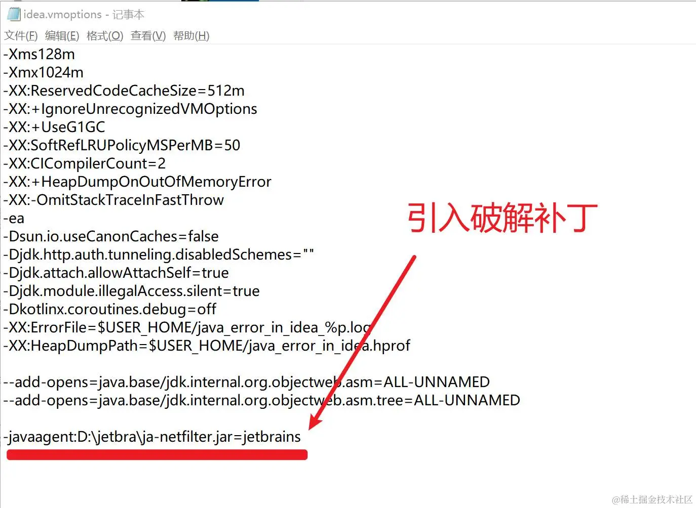 然后,脚本自动在 idea.vmoptions 文件中引用了破解补丁 :