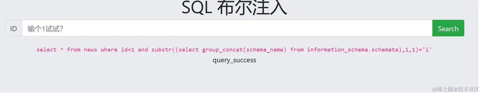 布尔盲注不适合这种情况,这个都会回显,并不区分查询成不成功,只要不是有报错就不会出现查询失败。(自认为,当然欢迎大佬指正)