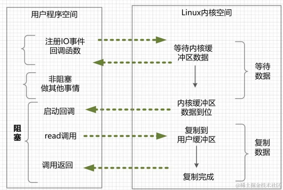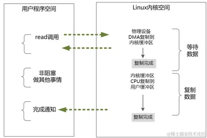 在异步 IO 模型中,在整个内核的数据处理过程中,包括内核将数据从网络物理设备读取到内核缓冲区、将内核缓冲区的数据复制到用户缓冲区,用户程序都不需要阻塞。
