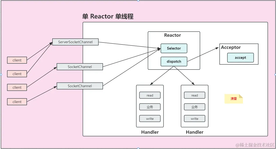 - Reactor :负责监听和分配事件,将 IO 事件分派给对应的 Handler,新的事件包含连接建立就绪、读就绪、写就绪等。