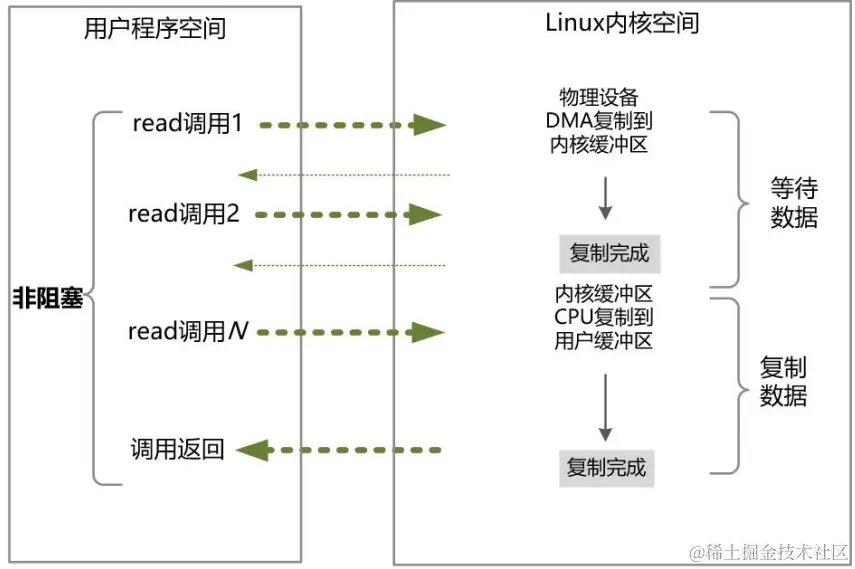 非阻塞 IO,指的是用户空间的程序,不需要等待内核 IO 操作彻底完成,可以立即返回用户空间去执行后续的指令,即发起 IO 请求的用户进程(用户线程)处于非阻塞状态,同时,内核会立即返回给用户一个 IO 的状态值。