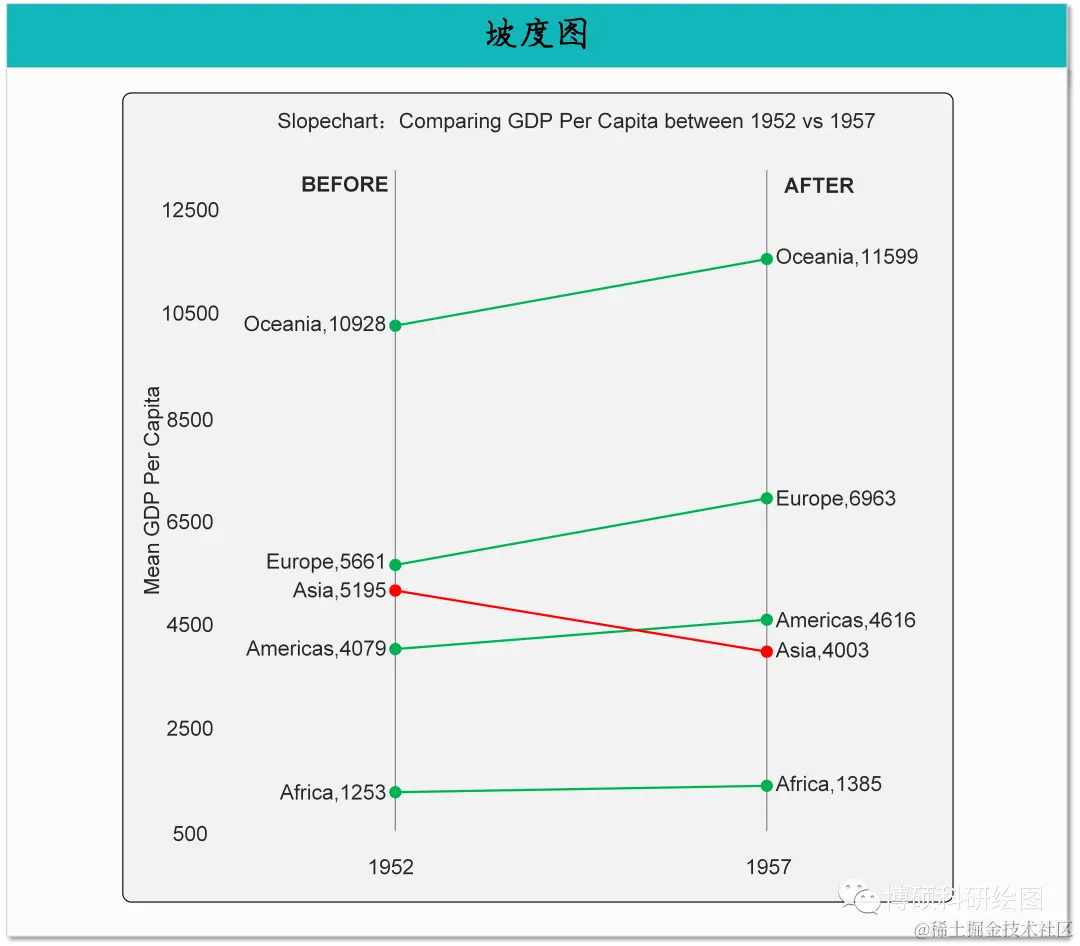 简介:坡度图(Slope Chart)是一种用于比较两个时间点或两个组之间的变化趋势的图表。 它通过在坐标系中绘制两个时间点或两个组的数据点,并使用连线表示变化的趋势。