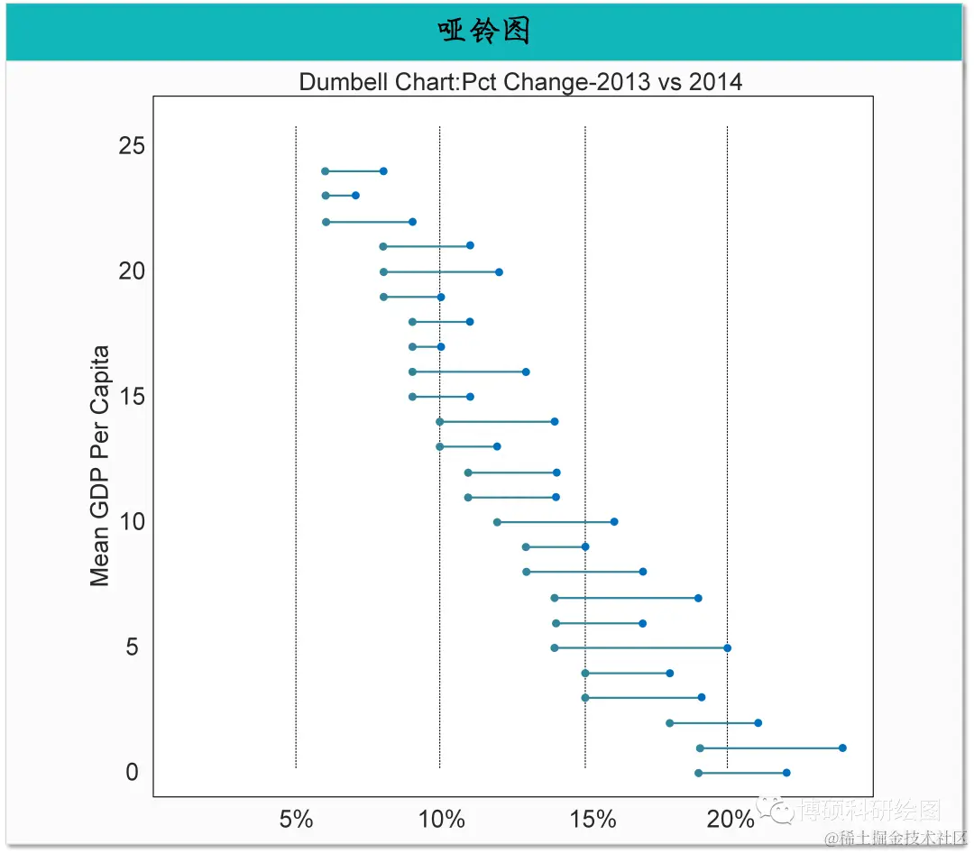 简介:哑铃图(Dumbbell Chart)是一种用于比较两个时间点或两个组之间的差异和相对大小的图表。 它通过在坐标系中绘制两个时间点或两个组的数据点,并使用水平线段连接它们。