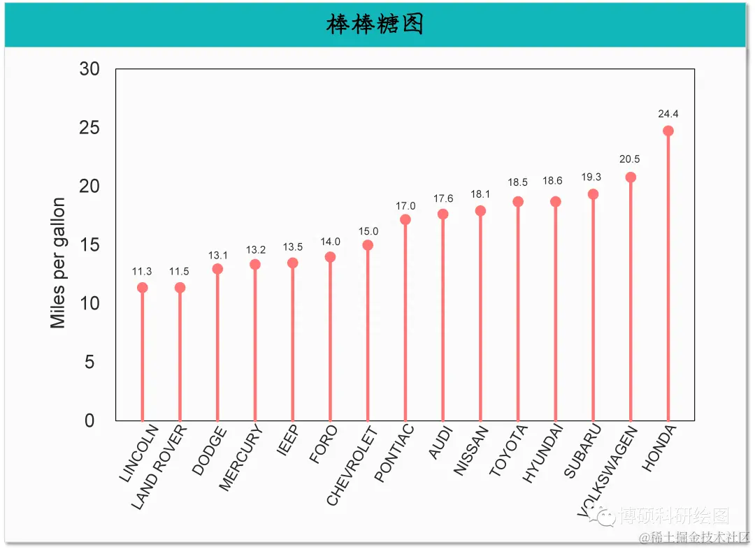 简介:棒棒糖图(Lollipop Chart)是一种用于可视化数据中不同类别之间的排序和相对大小的图表。 它结合了条形图和散点图的特点,通过在坐标系中绘制垂直的线段(棒棒糖的棍子)和圆圈(棒棒糖的糖球)来表示不同类别的数据。
