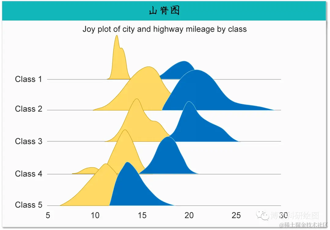 简介:山脊图(Ridgeline Chart),也称为密度曲线图或Joy Plot,是一种用于可视化多个连续变量的分布情况的图表。 它通过在坐标系中绘制多个密度曲线并将它们沿着垂直方向堆叠,形成一座像山脊一样的图形。