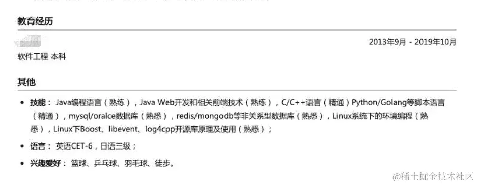 这道理很难懂吗?当然不是。那为什么前几年那么多人喜欢这么写呢?一方面,互联网快速发展的早期,招聘单位招人很多时候就是为了储备人才,筛选标准方面确实存在比较宽松的情况,这使得敢于自信地在简历上说自己精通 XXX 的候选人确实更容易蒙混过关;另一方面,可能也确实存在一些候选人没有能够拿得出手的项目,就是没得写,只好说自己擅长什么,熟练什么,精通什么了。