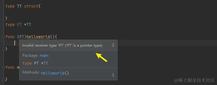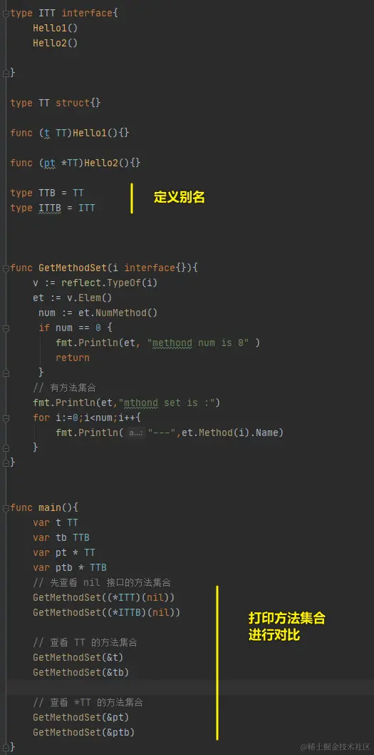 那么还是上述方法集合中的案例,我们分别给结构体 TT 定一个别名,TTB,给接口类型 ITT 定义一个 ITTB ,此时来查看别名的方法集合,与其原有类型的方法集合是否有差距