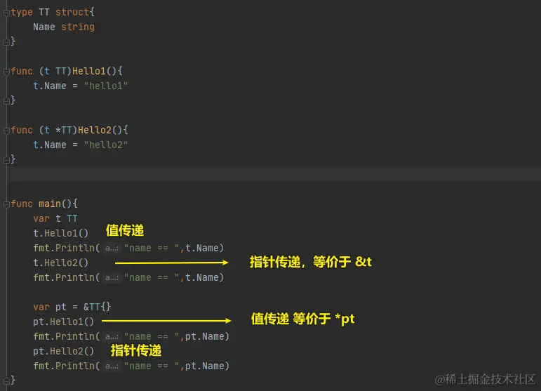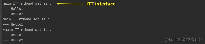 - 定义 TT 结构体,实现上述接口,其中 Hello1() 绑定 TT , Hello2() 绑定 *TT