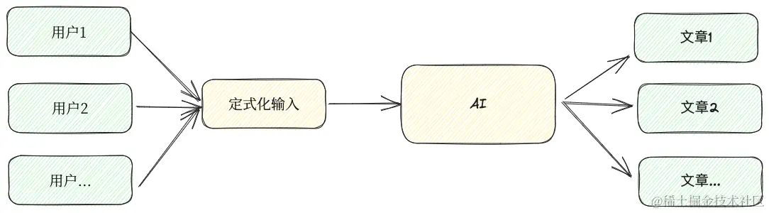 批量生产的特点是,不管是谁都可以生产出同样的产品。它最有价值的是生产线,而不是操作它的人。从这个角度看,AI和定式化的输入就是生产线,每个人都可以用相同的输入写出差不多的文章,是谁写的并不重要。在AI爆发的背景下,设计定式化的输入是这里最困难,最有价值的部分,而不是写出的文章。定式化的输入一旦被设计出来就可以被所有人使用。