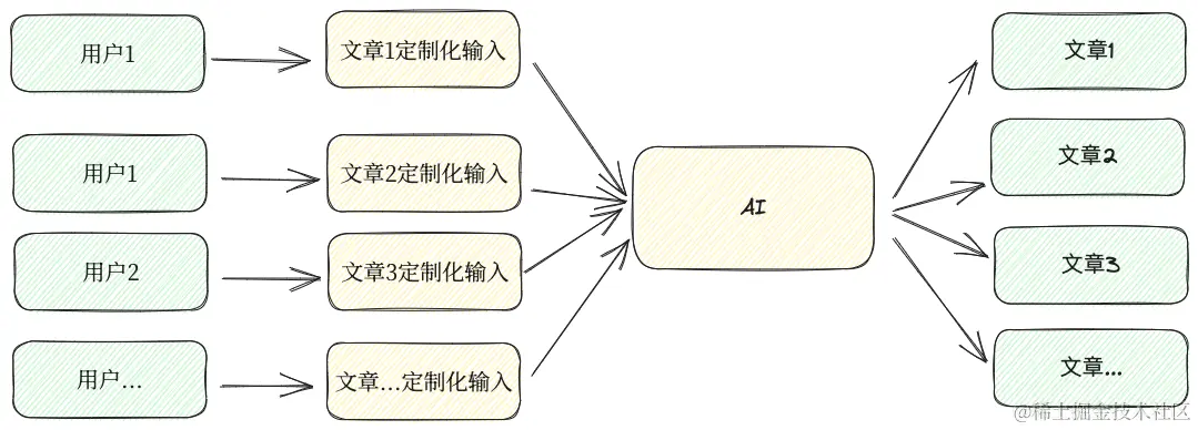 定制化生产的特点是,每个产品都是独一无二的,不同的人会生产出不同的产品。它最有价值的是进行定制化的人,而不是生产工具。从这个角度看,AI就是生产工具,每个人都会针对每篇文章仔细地设计他自己独有的输入,使得AI能够冒充他写出只有他能够写出的文章。设计定制化的输入是这里最困难,最有价值的部分,它无法复用他人的输入,也无法被他人复用,甚至同一个人的不同文章之间都无法复用。定制化的输入一旦被设计出来基本上只能使用一次。