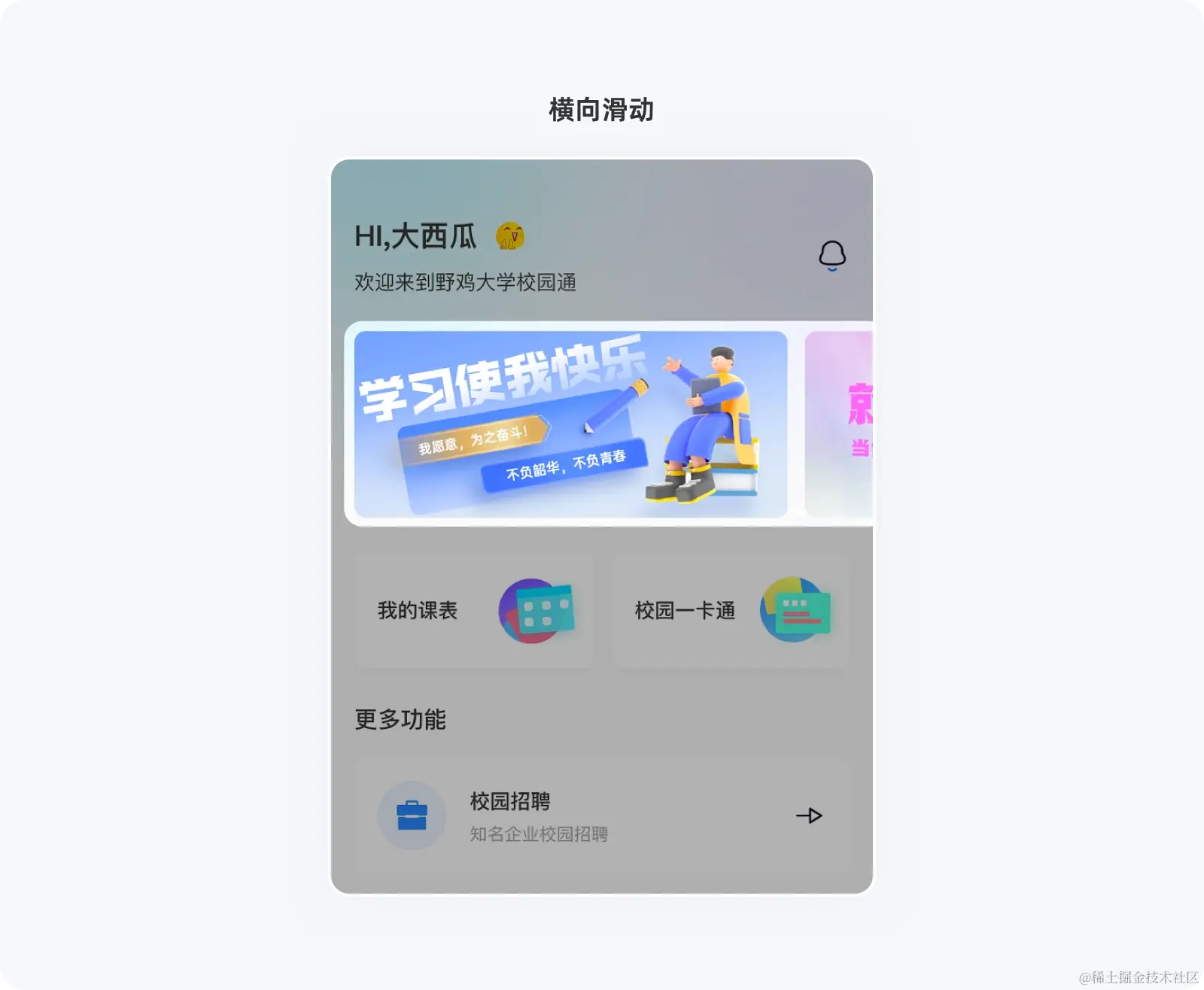 卡片式设计一度打破了移动端多为纵向操作、原有传统的列表式布局,在空间有限的移动端设备中,还能很好的利用横向空间。将横向滑动区域的最后一个卡片漏出一小部分(若隐若现才是诱惑),不仅能给予用户更多选择与期待,其空间利用率也得到了很好的扩展,在展示更多内容的情况下依然能保持模块的整体性。