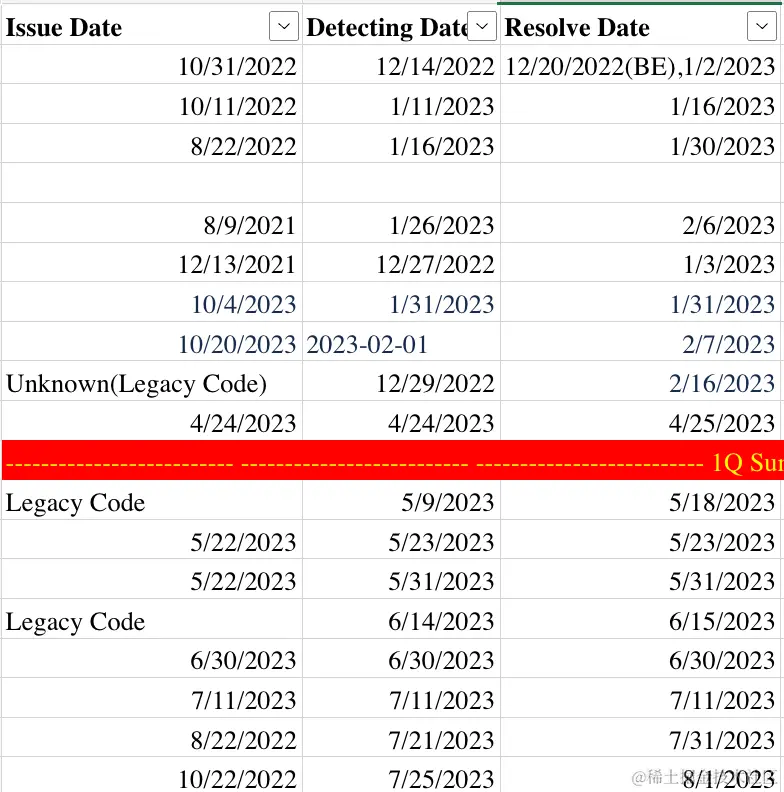 首先要确定降低故障的指标,MTTI和MTTD是关键,因为只有及时发现和定位问题才能快速消灭它们。我们暂时没有统计线上MTTI、MTTD的数据,因为缺乏相关的预警所以问题的发现和定位耗时通常很久,下面的一些复盘统计显示发现问题的时间可以持续甚至好几个月。