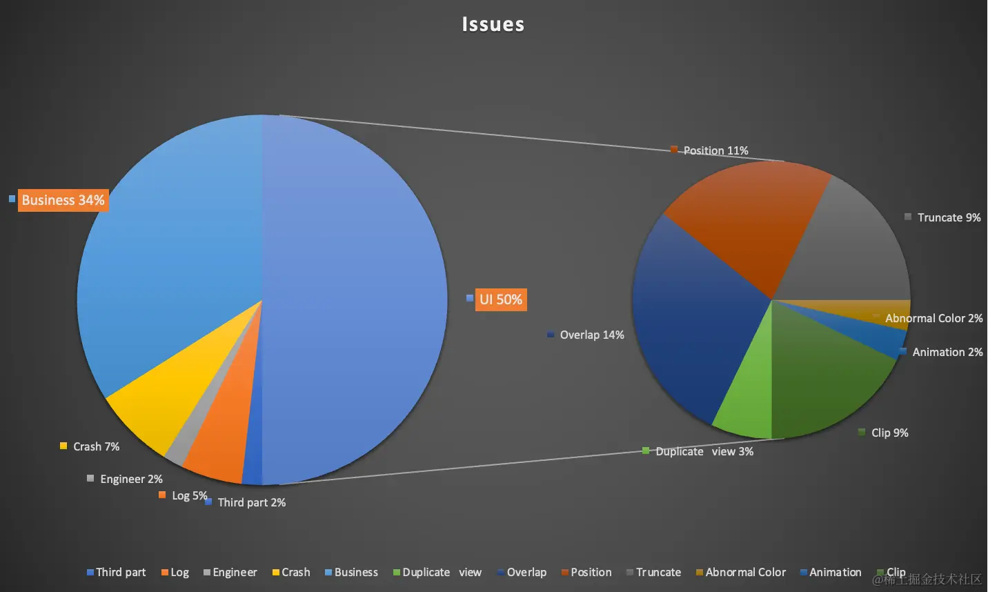 线上的问题中,UI和业务异常占比超过80%,这些问题发现的不及时,一方面是问题本身不会阻碍核心链路,另一方面说明团队对业务的稳定缺少监控手段。