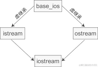iostream 从 istream 和 ostream 直接继承而来,而 istream 和 ostream 又都继承自一个共同的名为 base_ios 的类,是典型的菱形继承。