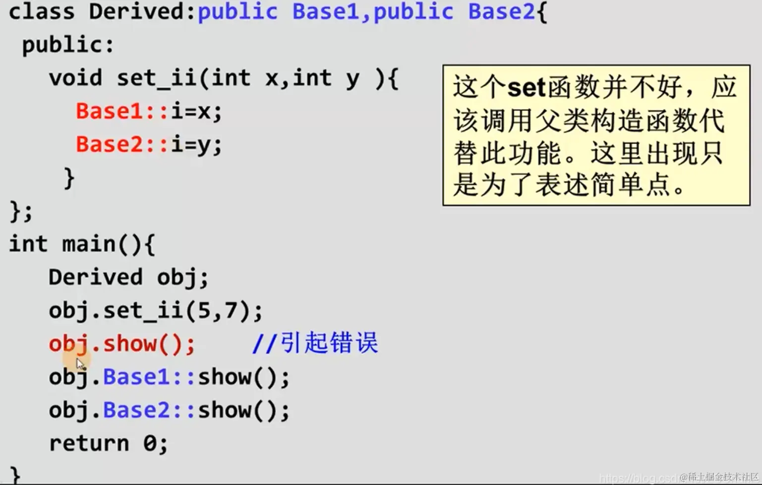 可以看到,使用多继承经常会出现二义性问题,必须十分小心。