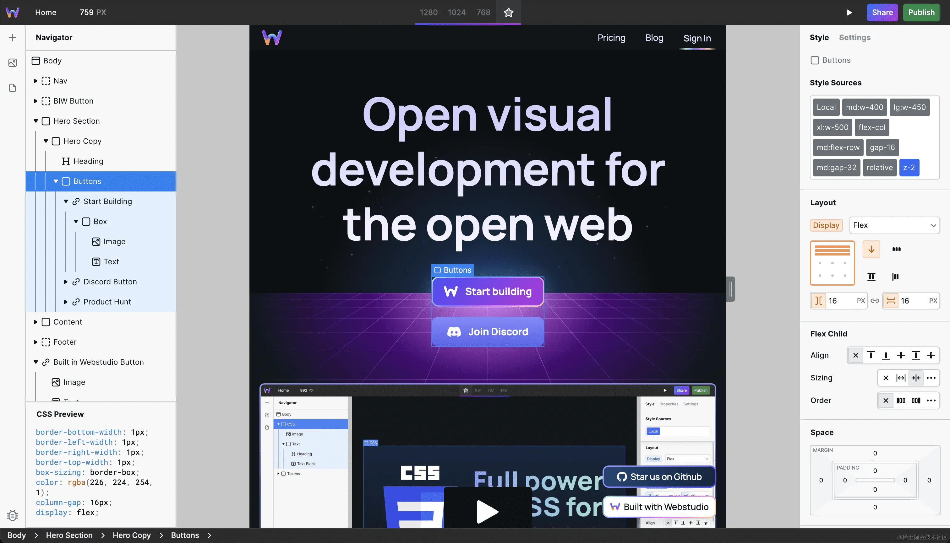 释放 CSS 魅力,让你可视化地进行 Web 开发。同 Webflow 类似,有了 Webstudio 设计师也能有 CSS 代码。