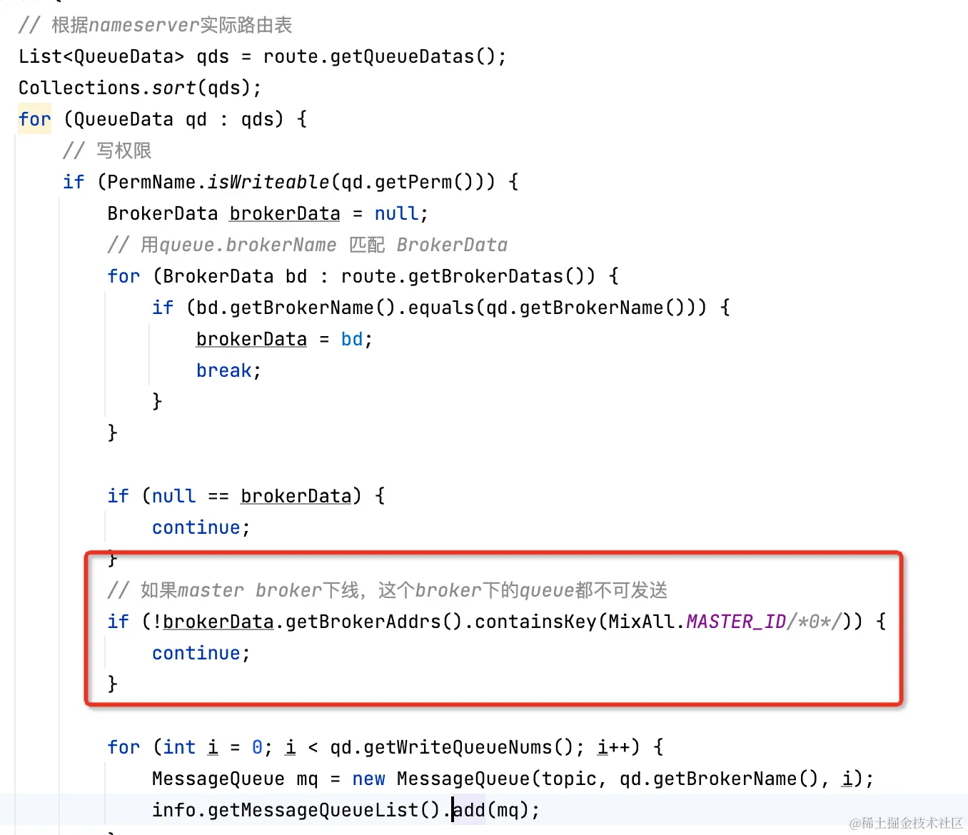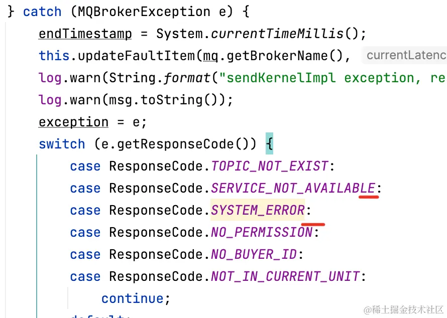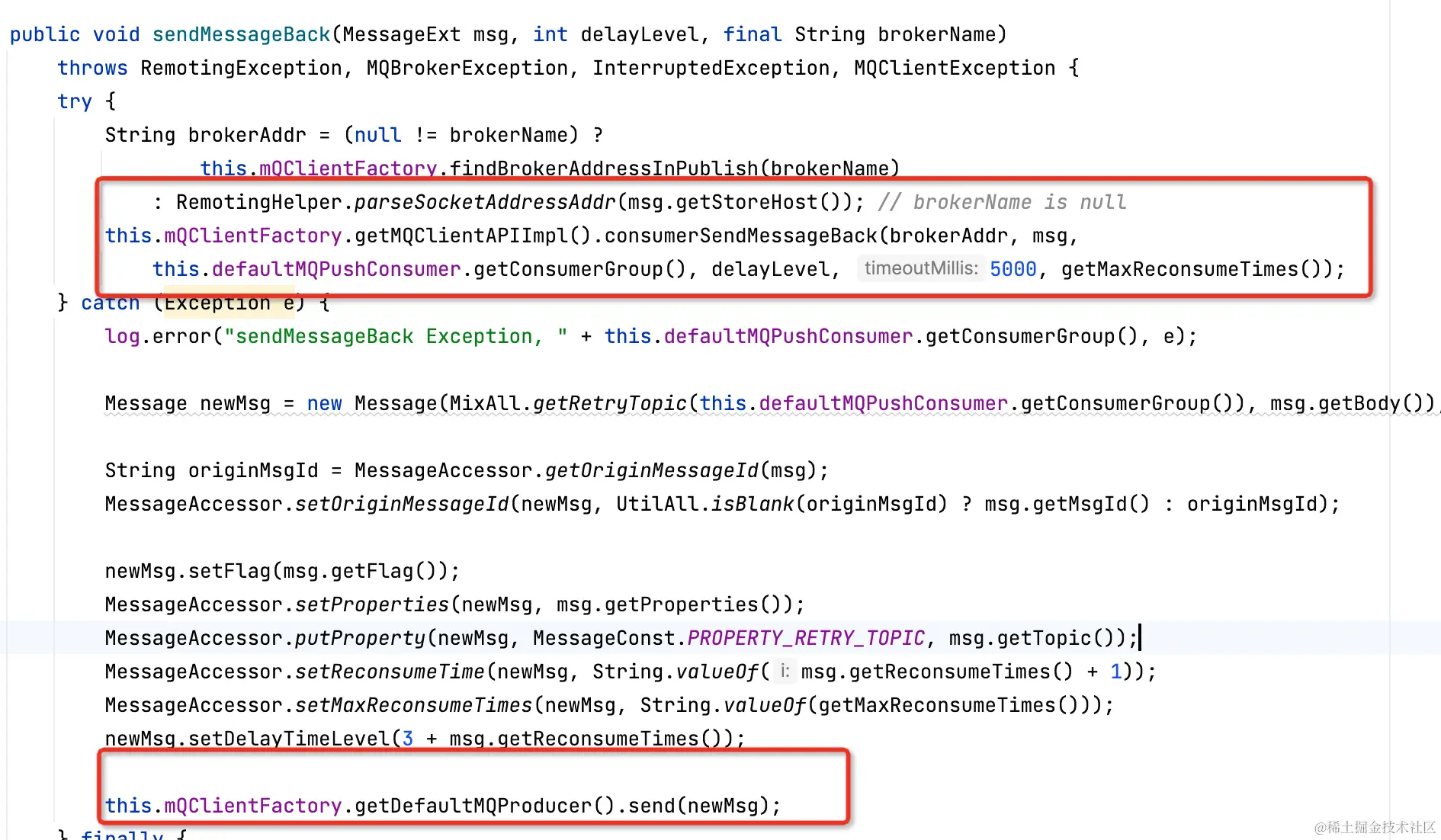 由于master下线,这里会发生异常,最终走普通消息发送流程。
