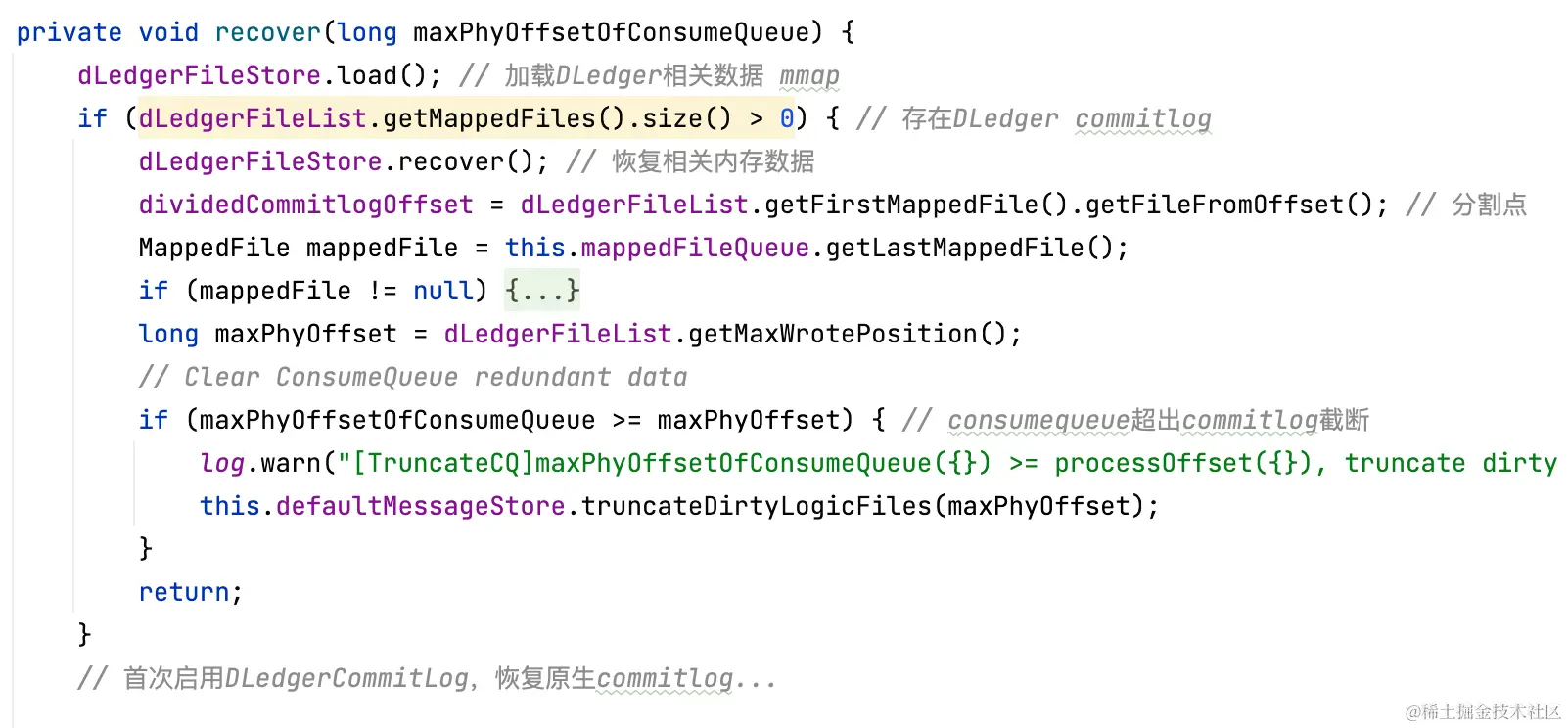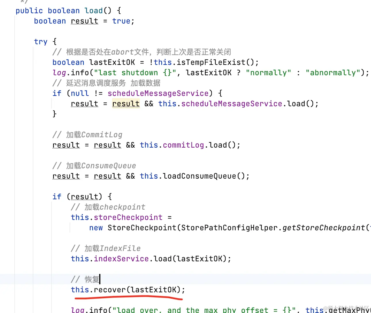 DefaultMessageStore#load:在一切文件加载完毕,执行recover恢复。