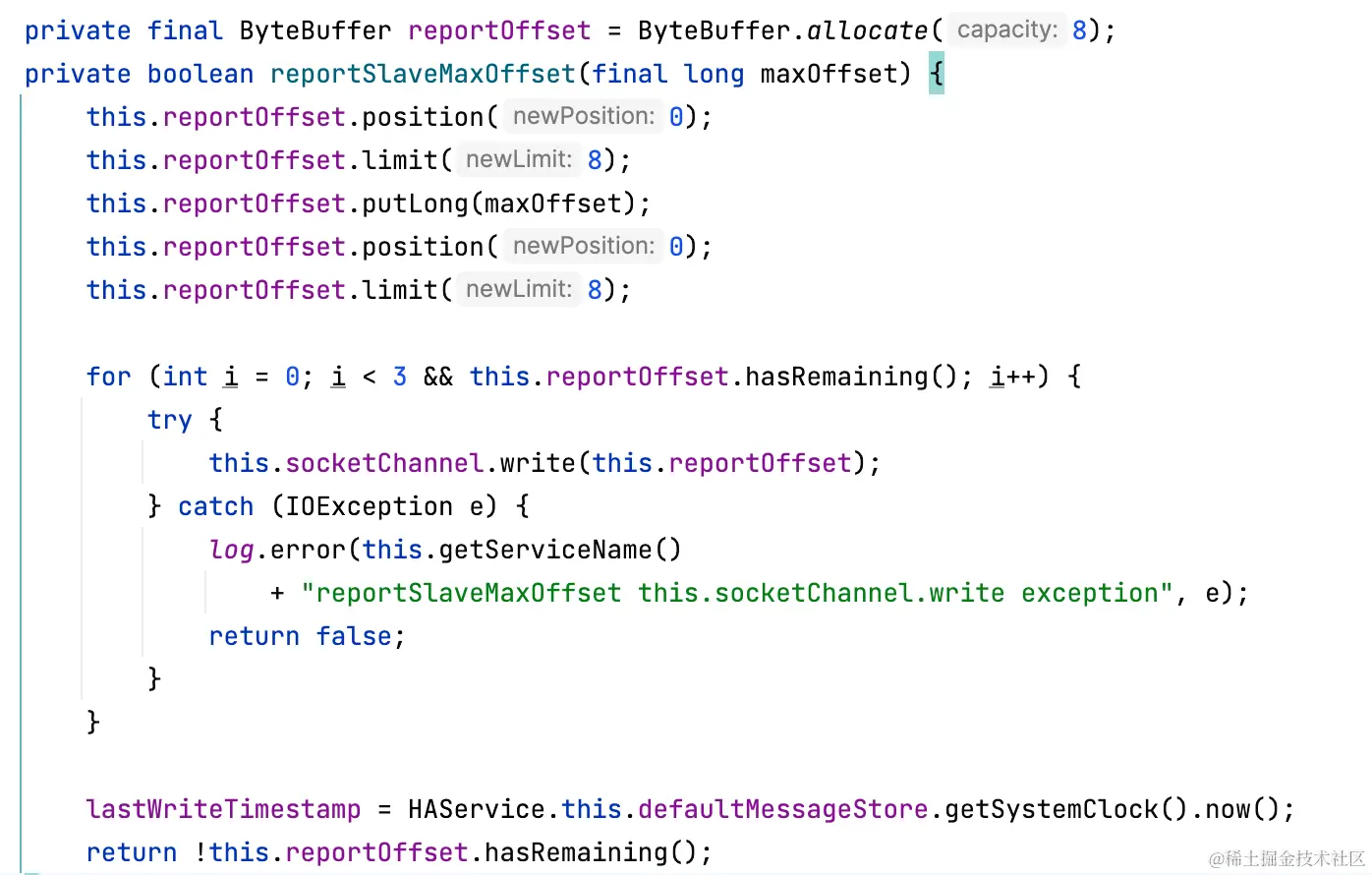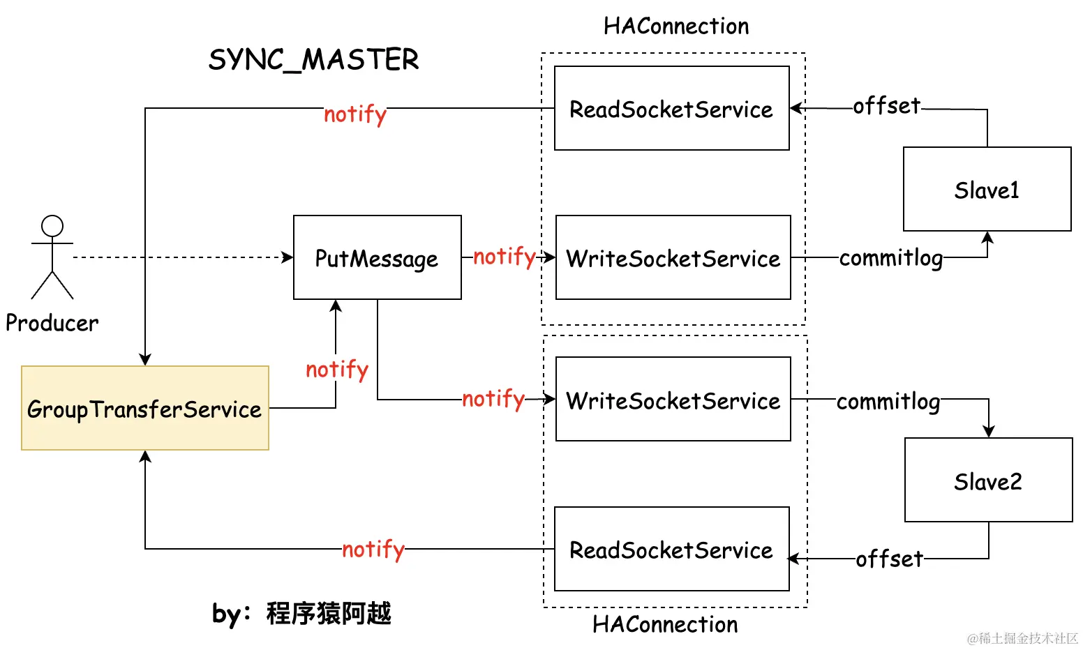 - master:ReadSocketService收到slave同步进度,WriteSocketService持续向slave发送commitlog buffer(最大32kb);
