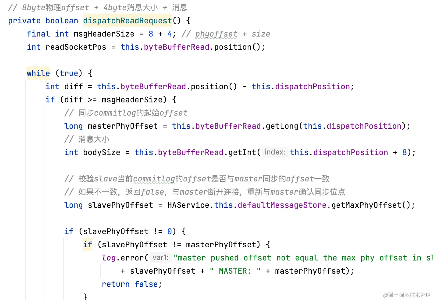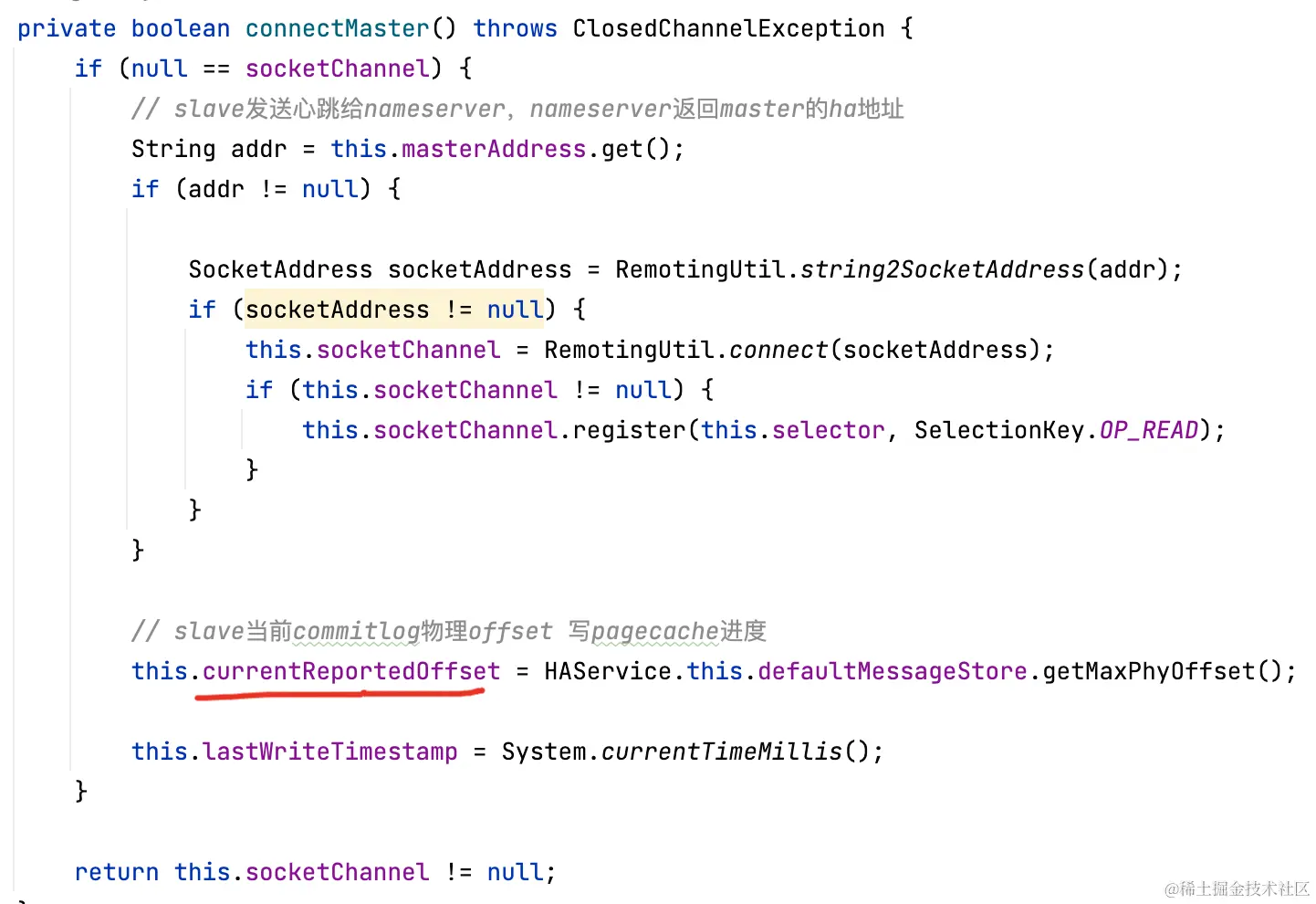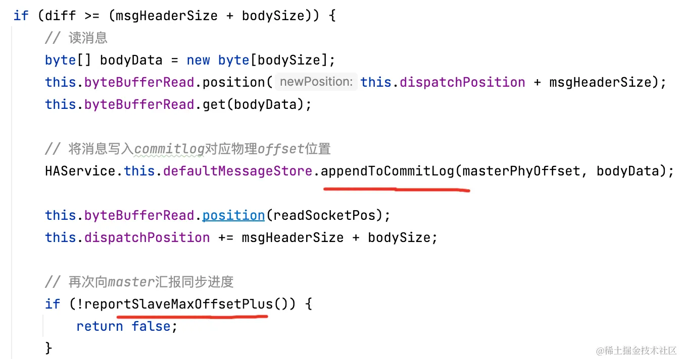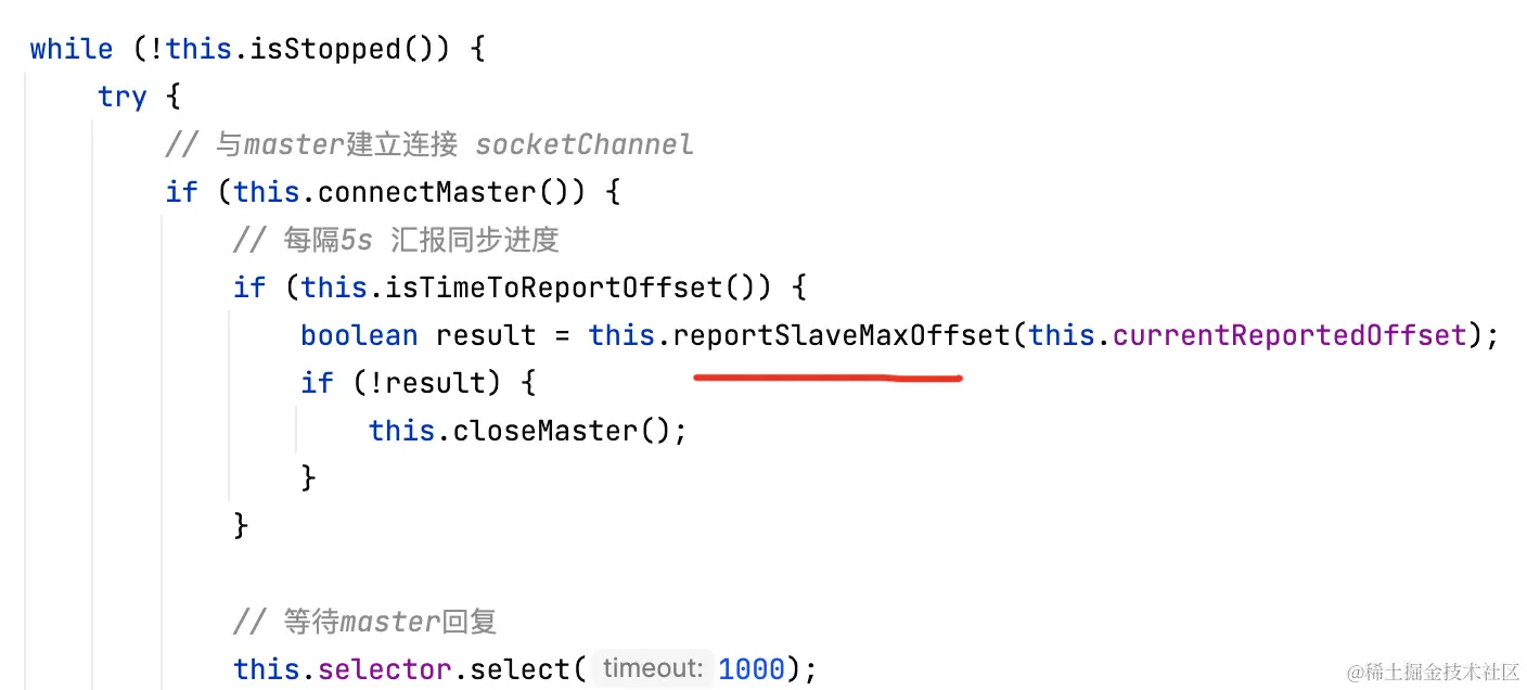 - slave:汇报当前commitlog的物理offset,即同步进度;
